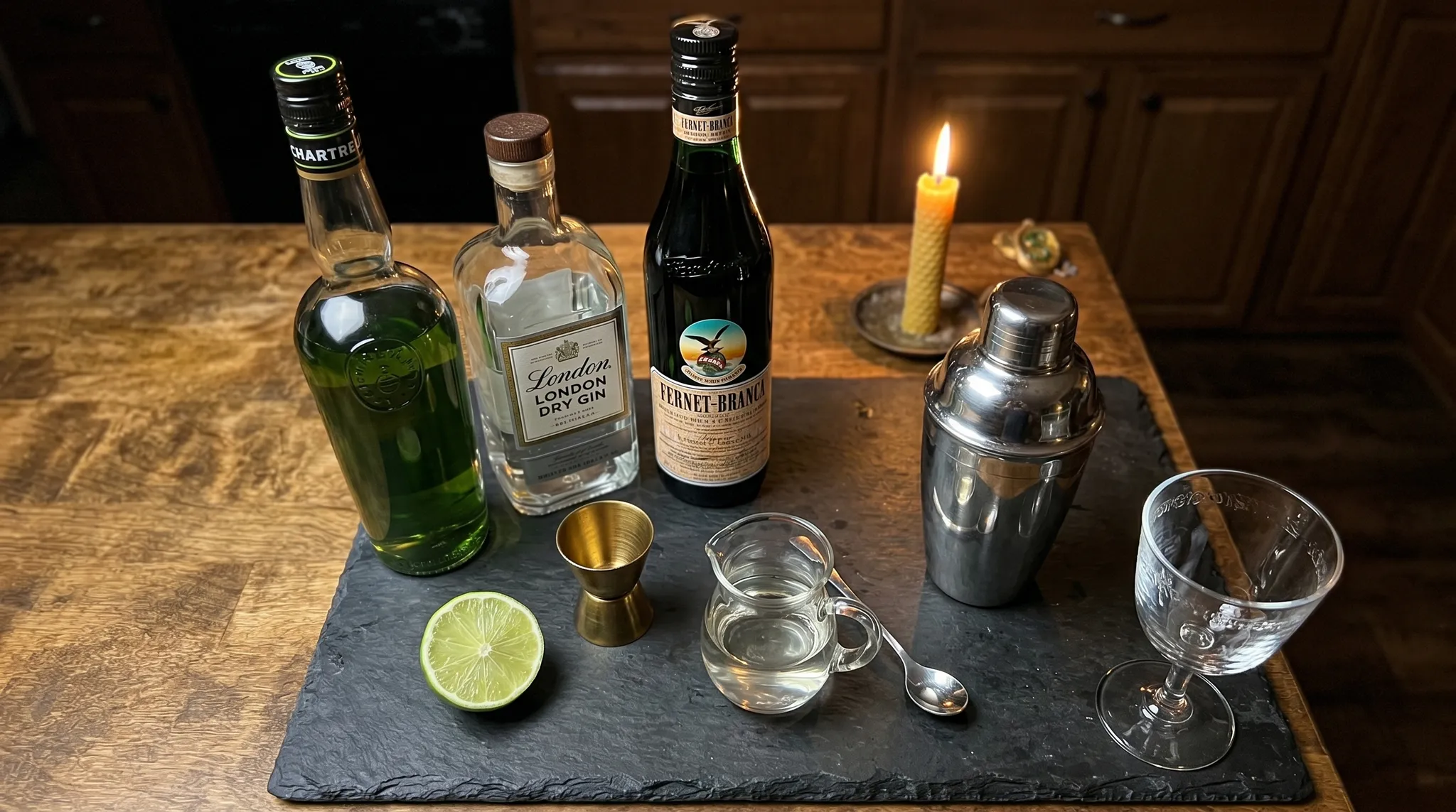 I needed bitterness — not cocktail-bitter, not the polite bitterness of Angostura in an Old Fashioned, but cost-bitter. The kind of bitter that makes you pause mid-sip and decide whether you’re going to keep going. Fernet-Branca does that. It’s aggressive and mentholated and deeply polarizing — people who love it love it, and people who don’t look at you like you’ve suggested they drink furniture polish. At half an ounce, it doesn’t dominate. It lurks. It sits underneath the Chartreuse and the gin and the lime like a question you weren’t expecting, and when it arrives on the back of your tongue, you feel it. You feel it the way you feel a chapter turning. It is exactly the ingredient that separates “pretty green cocktail” from something that earns its name.