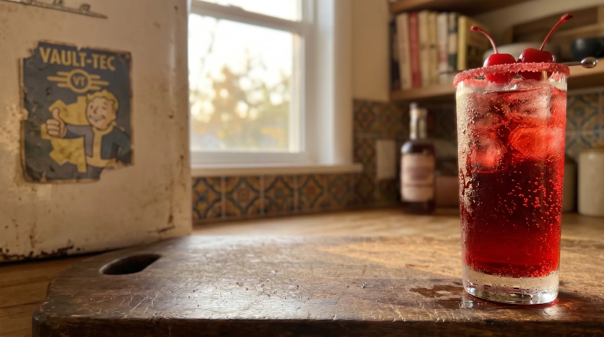So here it is. Five weeks of obsessing, fourteen tasting sessions, six batches, and one trip to an irradiated theme park later — this is Nuka-Cherry. It’s fizzy. It’s sweet but not too sweet. It’s that impossible cherry-red that you’ll stare at for a full thirty seconds before you take your first sip because the color alone is doing something to your brain that science hasn’t fully explained yet.