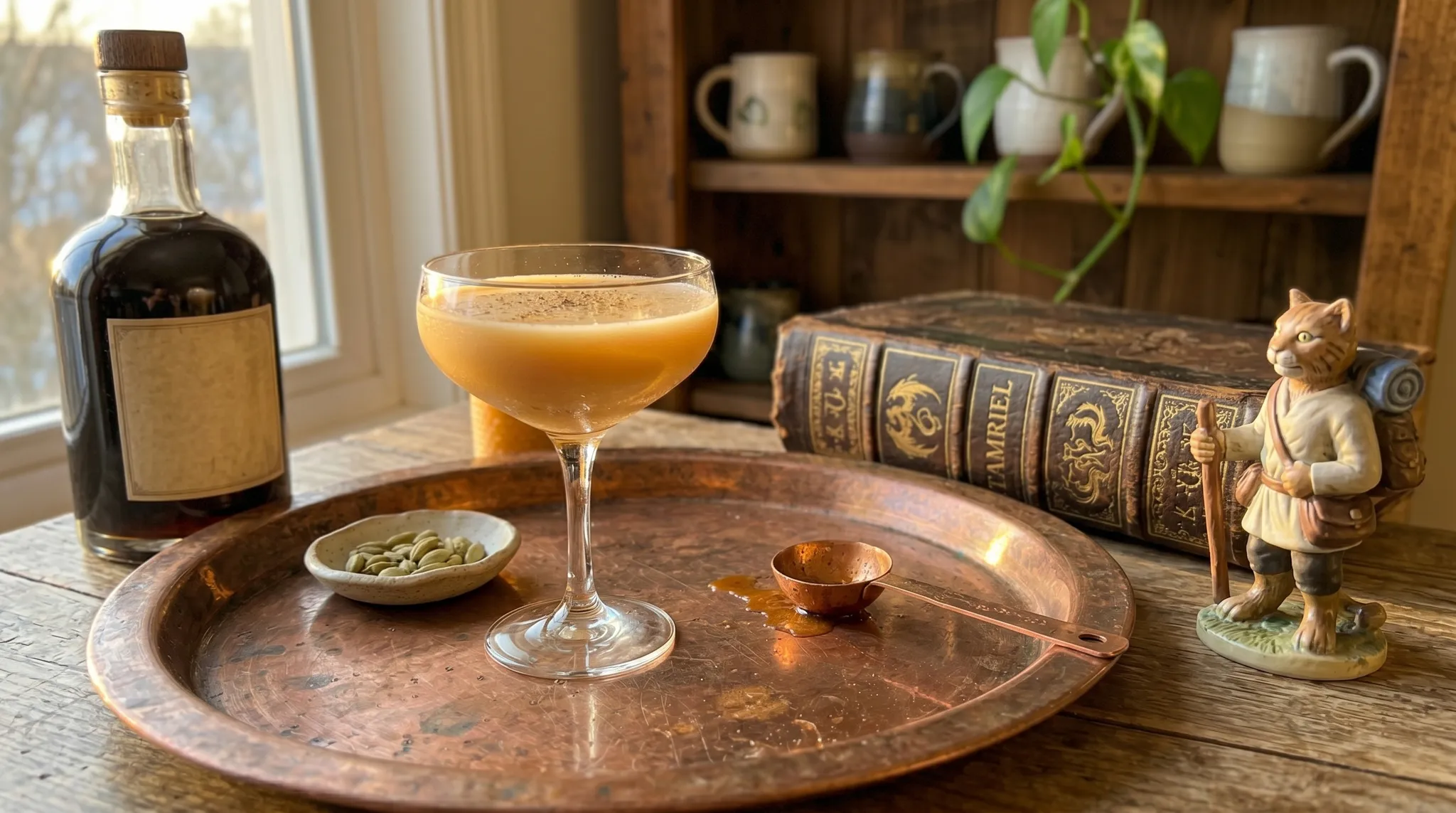 The coconut cream was a later addition and it changed everything. The original batches without it were good — flavorful, warm, complex — but they were missing the texture that makes skooma what it is. Skooma isn’t just a drink, it’s a mouthfeel. That thick, slow, almost velvety viscosity that makes it cling to the glass and coat your tongue. Coconut cream — real coconut cream from a can, the thick part, not coconut milk — gives you that body. It rounds out the spice and adds this subtle tropical sweetness that reads less “piña colada” and more “something from very far away.” The first time I shook a batch with coconut cream and strained it into a coupe and watched it settle — thick, gold, shimmering — I stood in my kitchen at one in the morning and said, out loud, to no one, “That’s it. That’s the one.” Mark, from the other room: “Can I have my counter back?” No. Not yet.