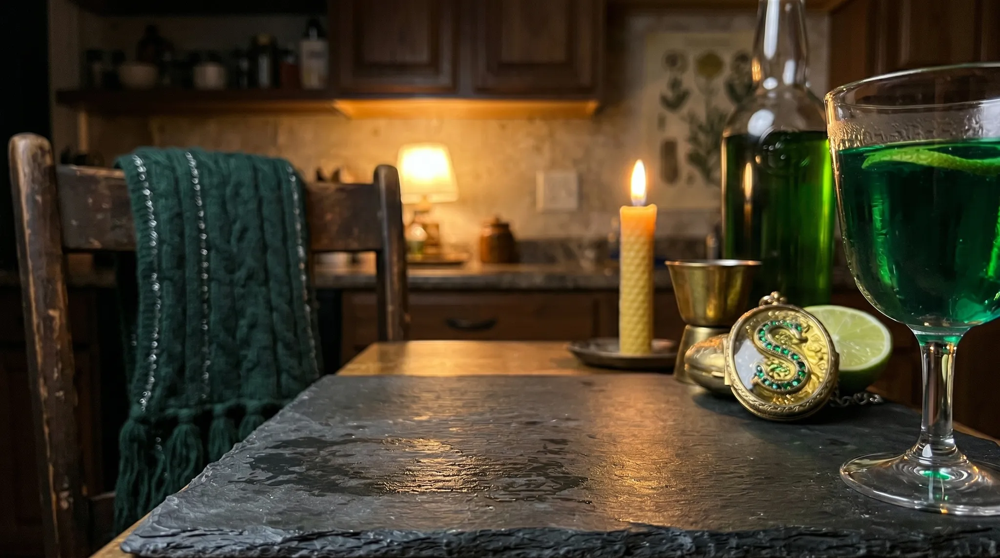The color was deep and herbal and alive — not the flat green of food coloring or the neon green of novelty spirits, but a green with layers to it, a green that changed as the light shifted, that looked one shade in the glass and another shade when you held it up to the light and another shade still when it caught the warm glow of my kitchen lamp. Complex, botanical, almost sentient in how it changes on your palate — the first sip gives you honey and anise, the second gives you mint and something you can’t name, the third gives you the feeling that you’re tasting something old. Not stale. Old. There’s a difference. Not easy. Not trying to be liked. Exactly like the potion in the basin.