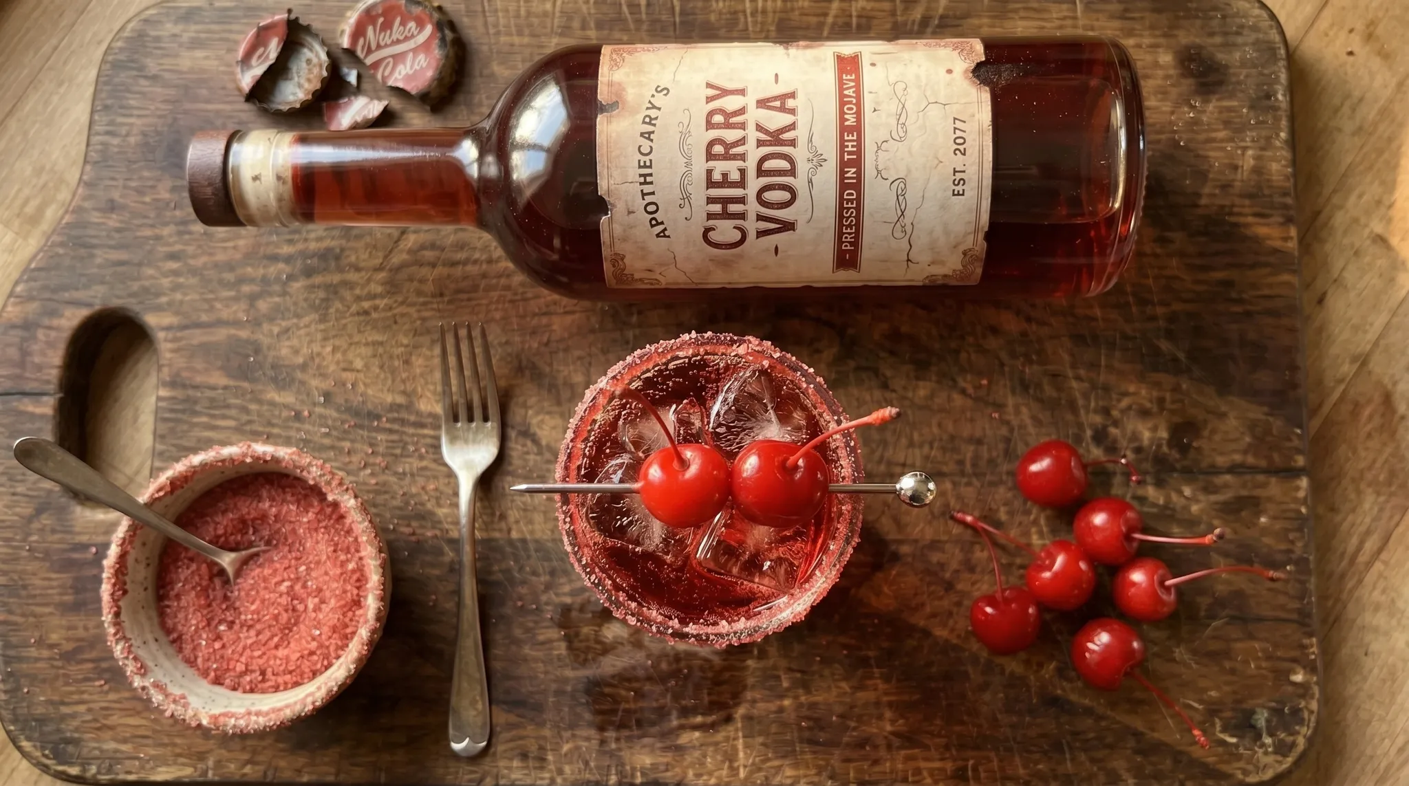 On the cherry vodka: I tested four brands. Smirnoff is fine, Pinnacle is too artificial, Absolut Cherrys has the best balance of real cherry flavor without tasting like cough medicine. If you can find Hangar 1 Makrut Lime — wait, no, wrong drink. Absolut Cherrys. The cherry flavor should taste like it remembers what a cherry tree looked like, not like it was designed in a lab. Although, given that Nuka-Cola was literally designed in a lab, maybe the irony is the point.
